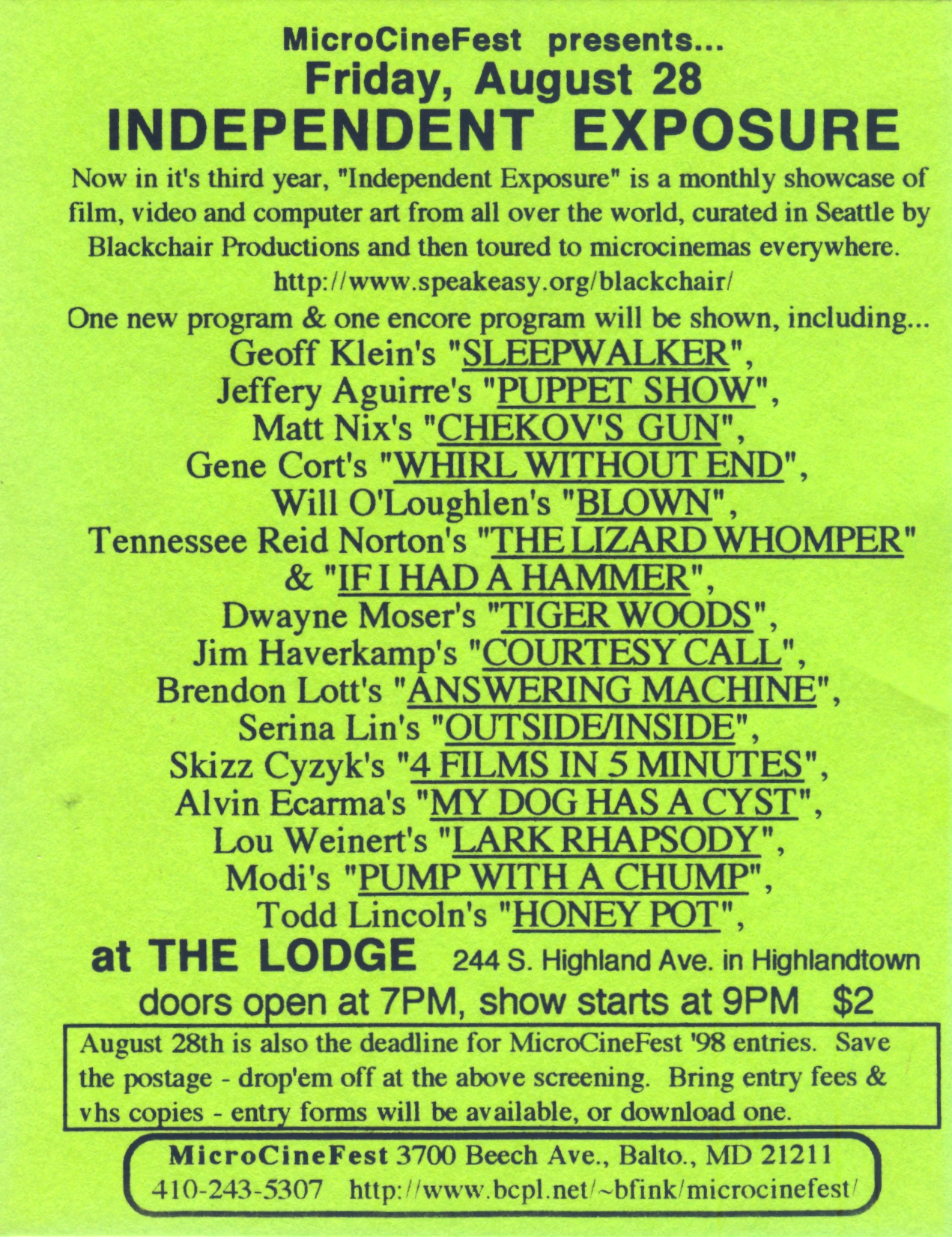 Wednesday, February 11, 1998 INDEPENDENT EXPOSURE - '98 PREMIERE: Michele Beck - "Speak" Gothic Productions - "Tender" Smellbob Media - "Creature-Nites Of Ohio" Mark O'Connell - "Wire Girl" dzigafilmsyndicate - "Enter The Shag" Tall - "Lovers Can't Think" Mathew McCormick - "Segment Clings Desperate" Niels Post & Ginger M. Adams - "Postcards From Mokum" Katrina Flener - "Geometry" Mark O'Connell - "Hooray! The Economy Is Booming" Susan Rivo - "Amy" Michael Krefeld - "Backtracking" Mary Siceloff - "Rant" THE H.O.M.E. GROUP'S MONTHLY INDEPENDENT OPEN FILM & VIDEO SCREENING Edwin Baker - "The Confession" film on video Pat Lehnerer - selected shorts film on video Paul Santomenna - "Vera's Toy" film on video Kevin Rubio - "Troops" video Michael Trainor - Montgomery Cliffs' "She Was Good" film on video Sean Williams & Evan Guilfoyle - "Act 3, Scene 4" 16mm Glasgow Phillips - "Sound Of One Hand Clapping" film on video Ken Hegan - "Farley Mowat Ate My Brother" video Ken Hegan - "William Shatner Lent Me His Hairpiece" video Smellbob Media - "Creature-Nites Of Ohio" video |