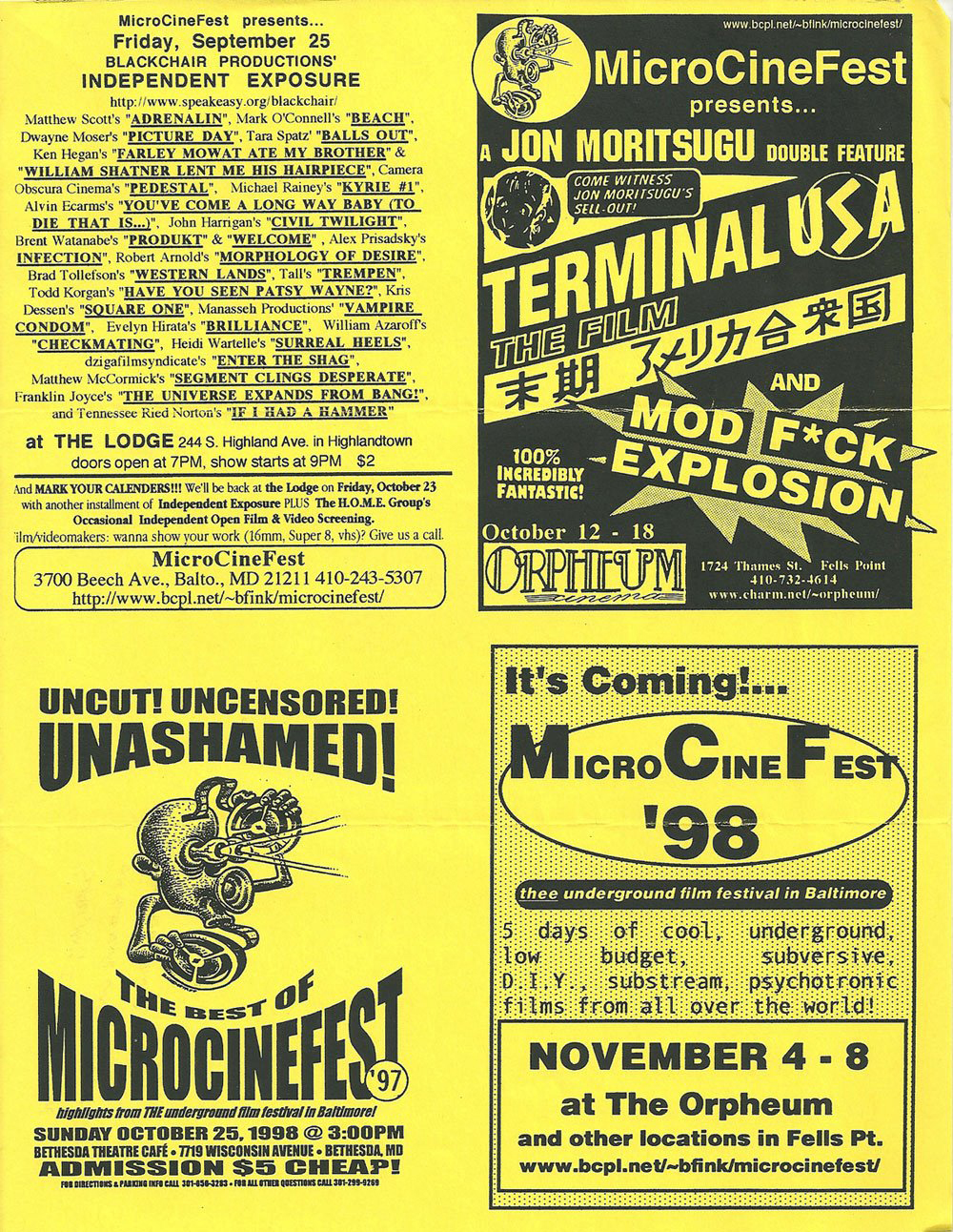 Film & Video Screenings Below is a list of film & video screenings that took place at the Mansion Theater in Baltimore, Maryland between March of 1993 and May of 1998. The list is not entirely accurate. Notes were not kept for the first year of screenings, so that part of the list is based on what was listed on the flyers that promoted the screenings. In other cases, notes were lost for screenings that happenned, so the date is listed but not the films that were shown, or else just the films on the flyers are listed. In most cases, the screening format used is listed after each film. Screenings usually happenned at least once a month, with an occasional break in programing for various reasons. Many of the films listed were part of The H.O.M.E. Group's Monthly Independent Open Film & Video Screening and were brought to the Mansion Theater by the filmmaker who made them. (On some occasions, 16mm prints or videotapes of rare or already licensed films were shown without proper permission.) With the exception of MicroCineFest '97, there was never an admission charge to the screenings. Instead, an optional donation of no more than $2 was asked for in a can at the door. The money was used to maintain a mailing list in order to keep people informed about the screenings. These screenings were set up by Skizz Cyzyk who also served as projectionist (Craig Smith also served as co-projectionist for the first year). If you're a filmmaker who showed something at the Mansion Theater and it does not appear on this list, please email to let us know, and give your name, title of your film, and the approximate date it was shown so that this list can be made more accurate. If you have any of the mailers that don't appear below, please let us know how we can get them, or a scan of them, to make this page more complete.